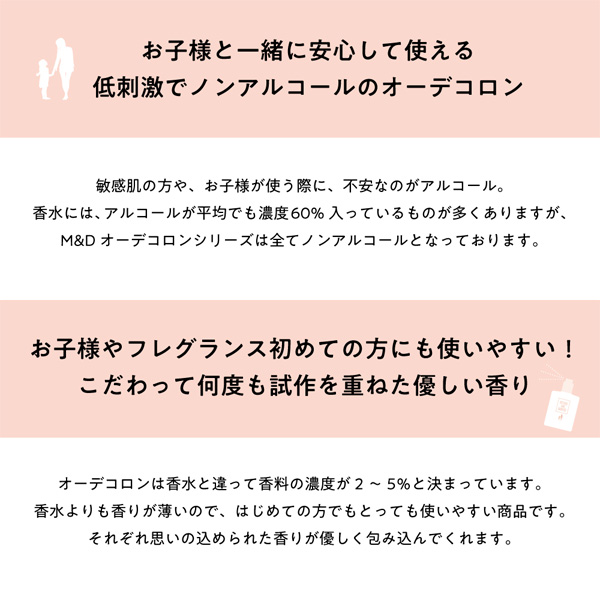 商品説明:お子様と一緒にご使用できます。ノンアルコールなので安心なオーデコロンです。さくらの香りだけでなく、つけた後は時間によってフレッシュでフルーティーな香りが爽やかに香ります。香りの特徴ですが、トップノートはレモン・グリーンアップル。ミドルノートはさくら・ジャスミン。ラストノートはシクラメン・ローズ・ムスク・シダーに変化していきます。お子様と一緒に使うときに不安なのがアルコールですよね。通常のフレグランス(香水)には、アルコールの平均濃度は約60%入っているものが多くありますが、このコロンはノンアルコールとなっております。お子様やフレグランス初めての方にも使いやすいです。